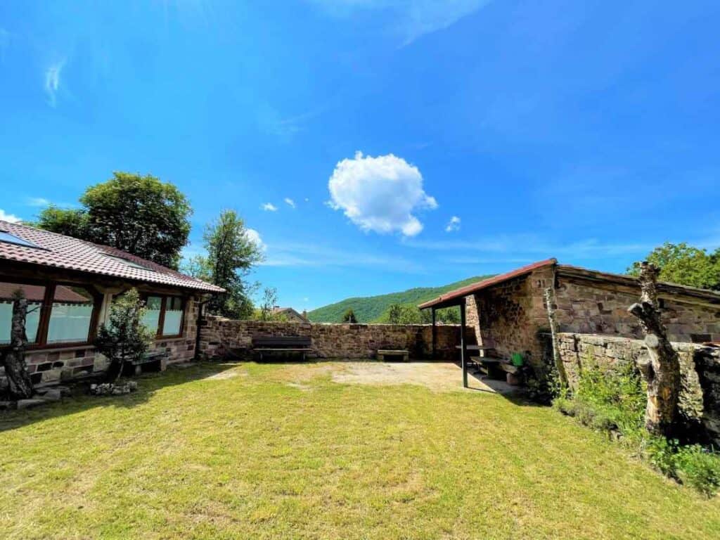 Frente a la casa esta el «corral» o patio con cesped y terraza parcialmente cubierta con mesas y sillas de jardin con vistas al pueblo y al frondoso monte de robles y hayas de Brañosera.